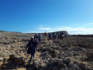 On Sunday 28 January, under blue skies, the Cyprus Strollers met again for the quintessential strolling experience along the coast of Oroklini, east of Larnaca. The sea, sand and sun delivered the Cyprus component, while the flat terrain was practically created for Strollers. The 4km waterfront section offered the group an 8km-long roundtrip opportunity to rest their eyes on the calm sea, and to admire touching expressions of nature from the community of seagulls, to scattered shells and a rare splash of fiery flowers on the beach. The comfortable route lent itself to conversation, as new Strollers were introduced to regulars, and friends chatted and caught up on one another’s news, snapping photos along the way. A fish and seafood meal at a nearby restaurant concluded this sea-focused day. Compliments to Maria for leading this outing, to Dina for composing this summary and to Nana, Ramzi and Nicos for the photos.