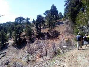 The outing of Sunday 5 May took us along the Persephone nature trail in the Troodos mountains, starting just a few minutes’ walk from Troodos square. This particular trail ranks among the most popular routes for several good reasons: It’s short and sweet – only 4 km each way and not demanding; It winds its way through beautiful forest patches that offer welcome shade; It ends at a point that grants you quintessential Cyprus views across green forests, a large dam, the salt lake and Limassol Bay.